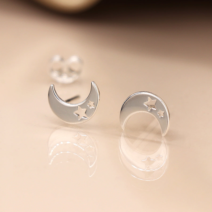 Sterling silver crescent moon stud earrings with two little stars cut outs in each