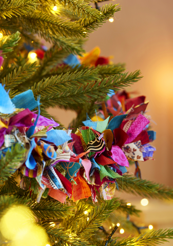 A gorgeous multi coloured garland of recycled sari fabric tinsel to display for celebratory occasions. The funky fabric strands extend all around, making it simple to create 'wow' room designs and a personalised individual space. Use the end hanging loops to hang horizontally or vertically. Experiment by layering with other colours in the range for eye-catching decor all year round. Enjoy these sustainable, eco friendly and versatile decorations.