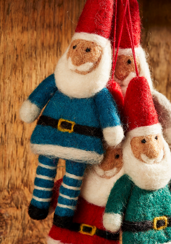 Wool felt novelty Santa, festively dressed and threaded as a hanging tree decoration. The handmade needle felt is artisan crafted from eco friendly, sustainable and biodegradable wool. A cheery display in a child's room, nursery or play area hung out of reach for unbreakable seasonal scenery. Just the kind of Christmas decoration to become an annual favourite, treasured in a child's memory.