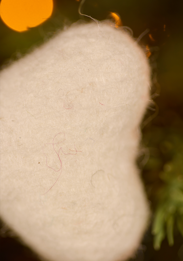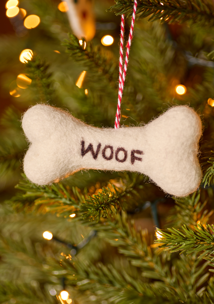 A wool felt bone shaped hanging decoration with 'WOOF' message. Fitted with a red and white hanging thread. From a new range of sustainable eco friendly Christmas decoration ideas designed in-house at Namaste.