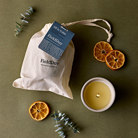 All is Calm Wintertime Candle. Each large candle comes in a branded cotton FieldDay bag, perfect for gifting.