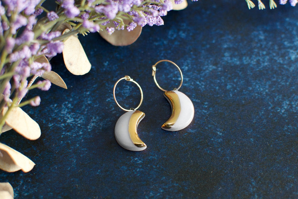 Handmade earrings made porcelain and genuine 22k gold lustre on gold-fill hoops.
