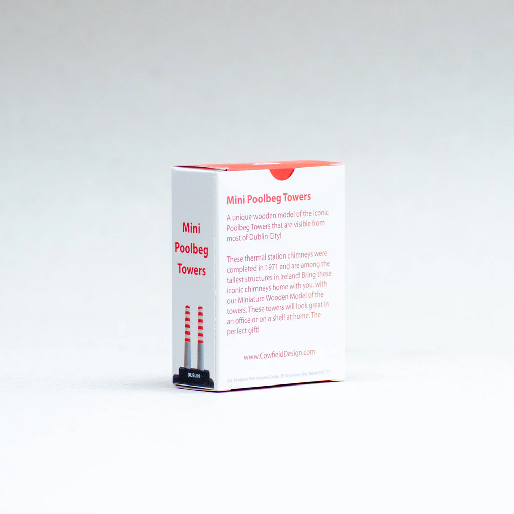 Mini Poolbeg Towers, A unique wooden model of the Iconic Poolbeg Towers that are visible from most of Dublin City! These thermal station chimneys were completed in 1971 and are among the tallest structures in Ireland! Bring these iconic Chimneys home with you, with our Miniature Wooden Model of the towers. These Towers will look great in an office or on a shelf at home.