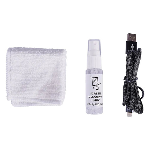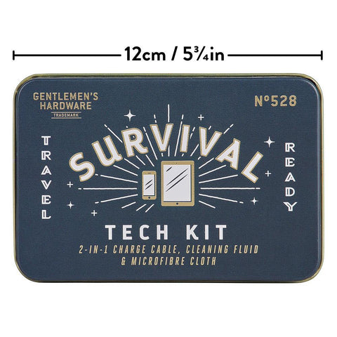 Survival Tech Kit comes with 2-in-1 charge cable (Micro USB and Lightning), 20ml cleaning fluid and microfibre cloth. Packaged in a giftable tin.