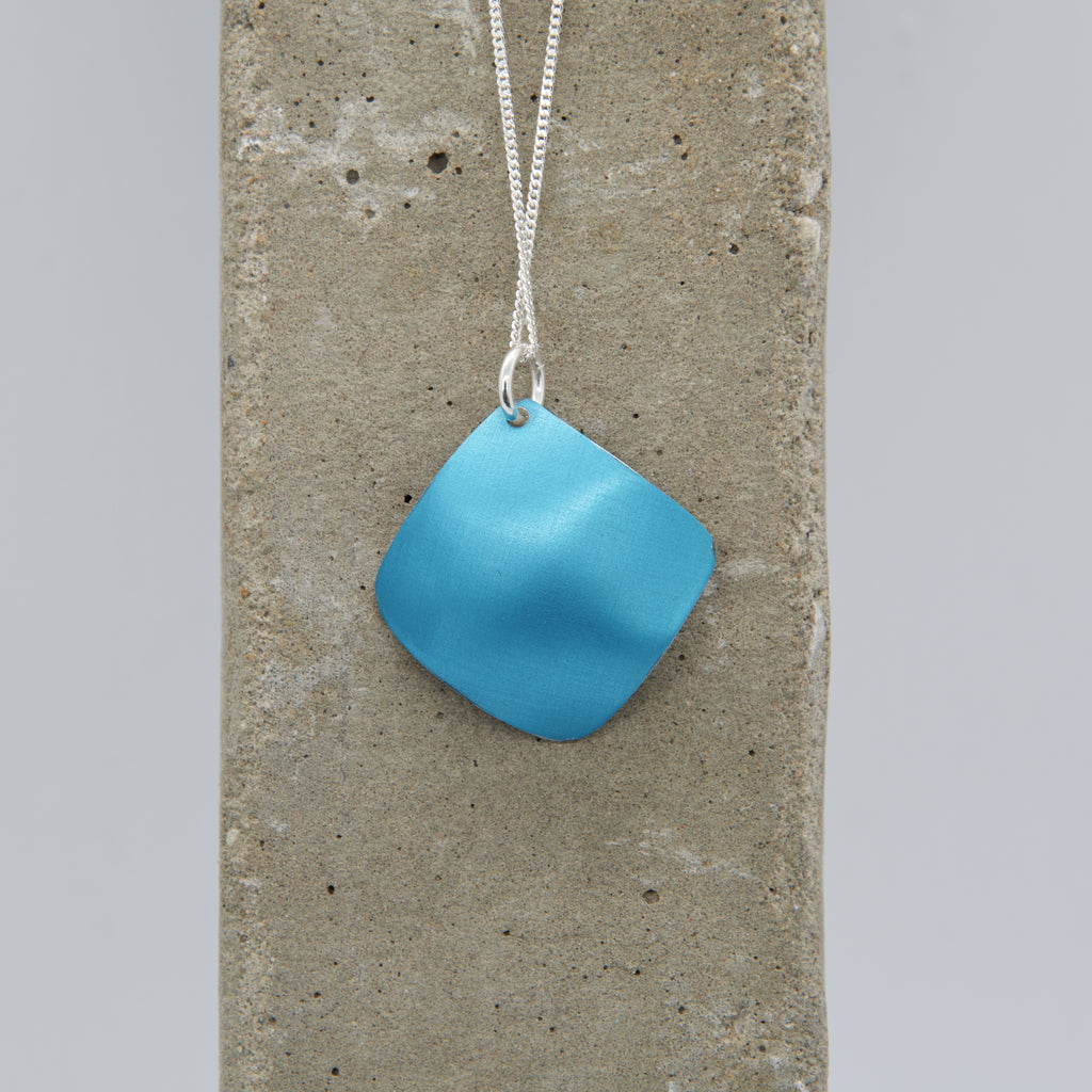 Lisa paints unsealed anodised aluminium with specialist aluminium inks, she then submerges the metal in a dye bath to create interesting variations of colours and prints. The metal is finally steamed which permanently seals the colour. Each piece is hand made in her Glasgow based studio. All designs are pierced, formed, filed and polished by hand for a beautiful finish.